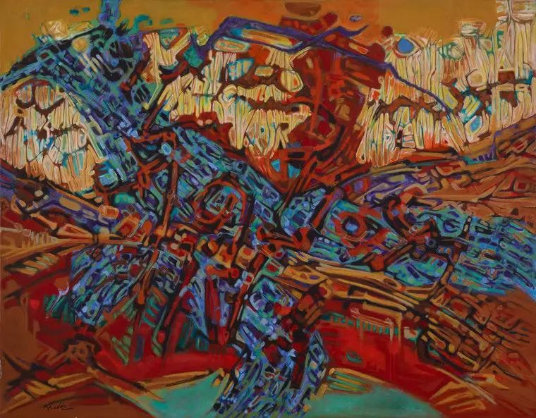 At its core, the School of the Sign explored signs: the shapes of letters, calligraphic forms, carvings, rock-inscriptions, rather than readable text. These “signs” were layered over abstract fields, textures and saturated palettes, enabling artists to draw on visual traditions of the Maghreb (calligraphy, Berber scripts, rock art) while engaging the language of Western abstraction. In this way, the movement wasn’t a nostalgic return to folklore but a forward-looking synthesis: a modern art emergent from Algeria’s cultural realities.