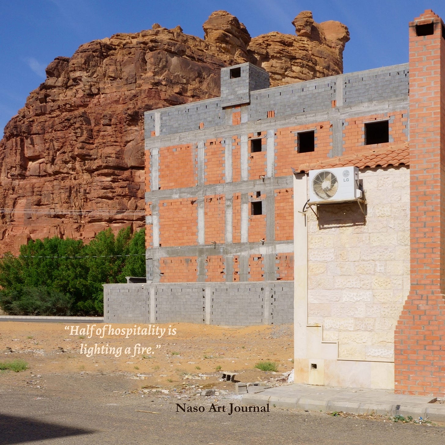 His piece, Fireplaces of Al Ula begun as a result of an enduring affinity to fire and the unsaid meanings and practices surrounding it. Ali expanded on this beautifully, explaining how the notion of consuming energy as a collective act - lighting a fire and inviting others to join you - is a gesture of hospitality more raw than even that of sharing a meal. “That to me, as a gesture, feels really truthful”, he says. As the project grew and allowed him to see more of Al Ula, Ali explains that a conscious motivation to understand the place grew with it. The project’s exhibition text touches on how these fireplaces are a “signpost for the changing social and economic dynamics of Al Ula”, given that more and more of them are beginning to disappear. NASO asked Ali whether anything else might have stuck out to him as a signpost of these changing dynamics. “Artificial rock would probably be another”, he says, elaborating that these formations can be taken as signpost of societal changes, and a larger marker of Saudi Arabia’s vision 2030.