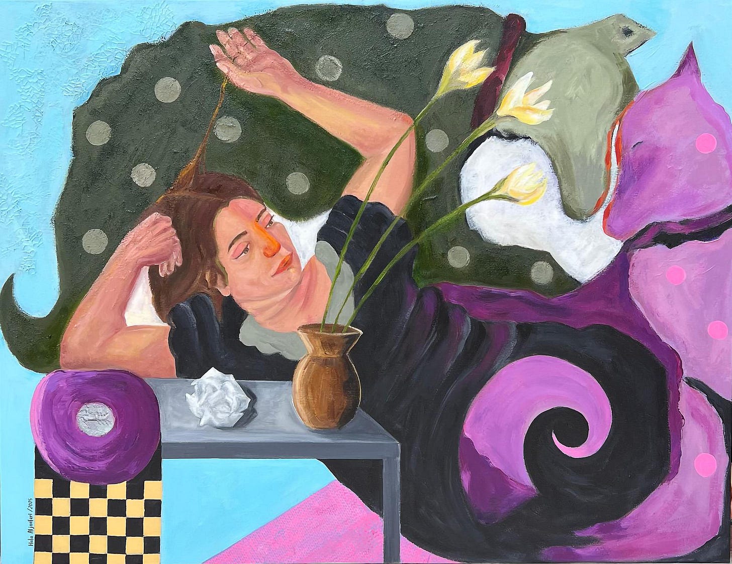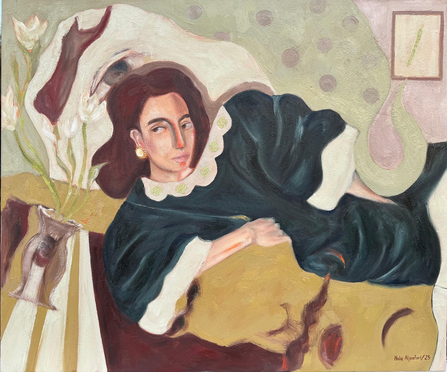 Hala Aljaafari, a Syrian visual artist and interior designer now based in Doha, Qatar, has built a practice that delicately interlaces memory, human emotion, and personal narrative. Working primarily with oil, acrylics, and mixed media, she creates paintings that are deeply rooted in both lived and imagined experiences.