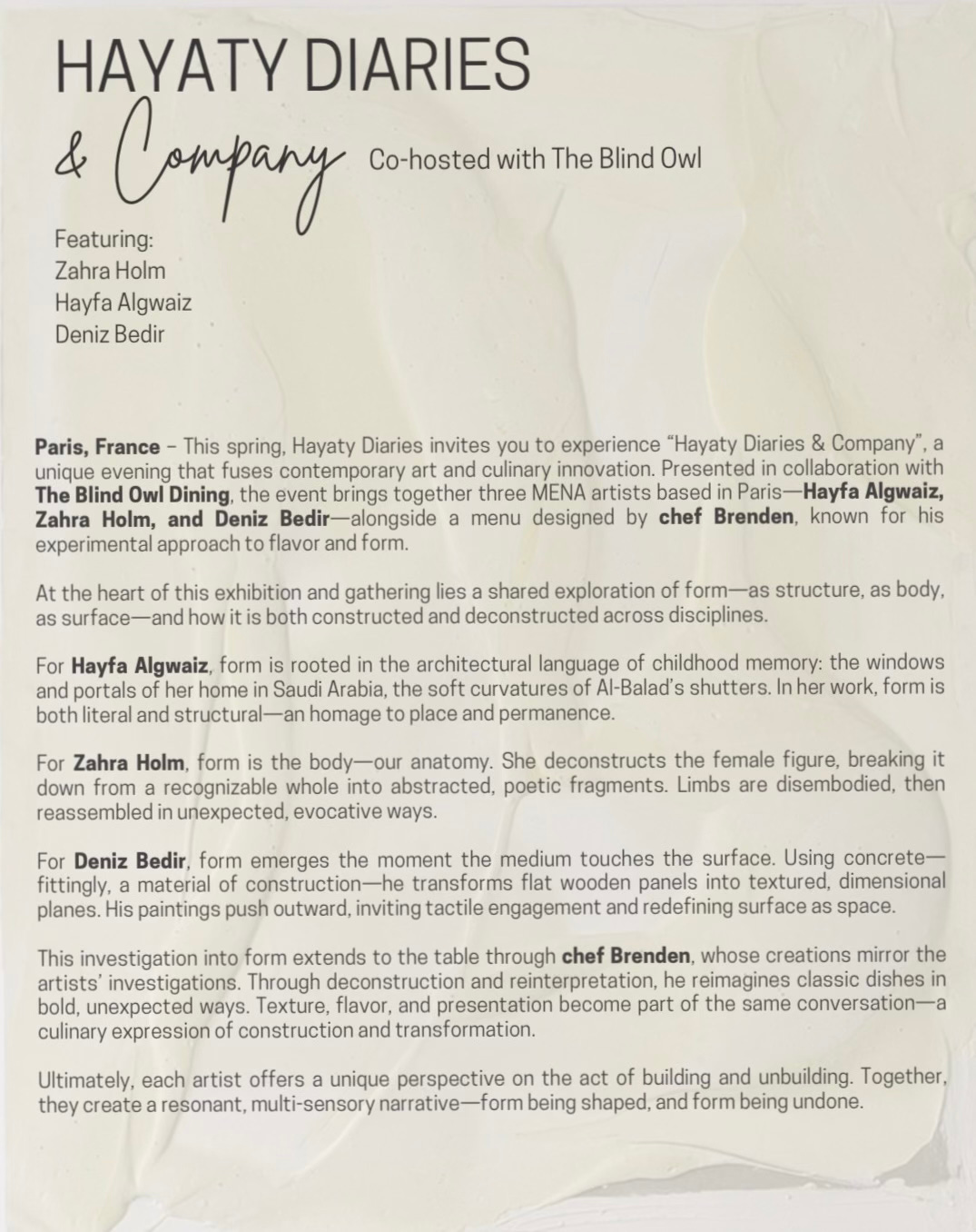 And yet, this fluidity is precisely what defines Hayaty Diaries. “It’s what makes us special,” Kinzy affirms. Their recent Paris event, which marked the launch of a new hybrid series titled Hayaty Diaries & Company, was a prime example. It wasn’t just an exhibition—it was an immersive evening combining art and dining, showcasing three MENA artists in tandem with a conceptual menu crafted by Chef Brenden of the Blind Owl Dining Group. “We explored the theme of ‘form and deconstruction’ not just visually, but also through the culinary experience,” Christina says. “It was our first time featuring a male artist too—another significant step forward.”