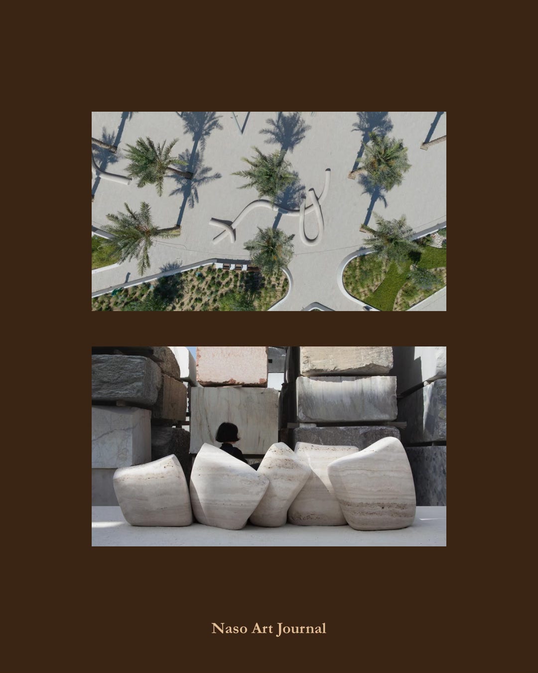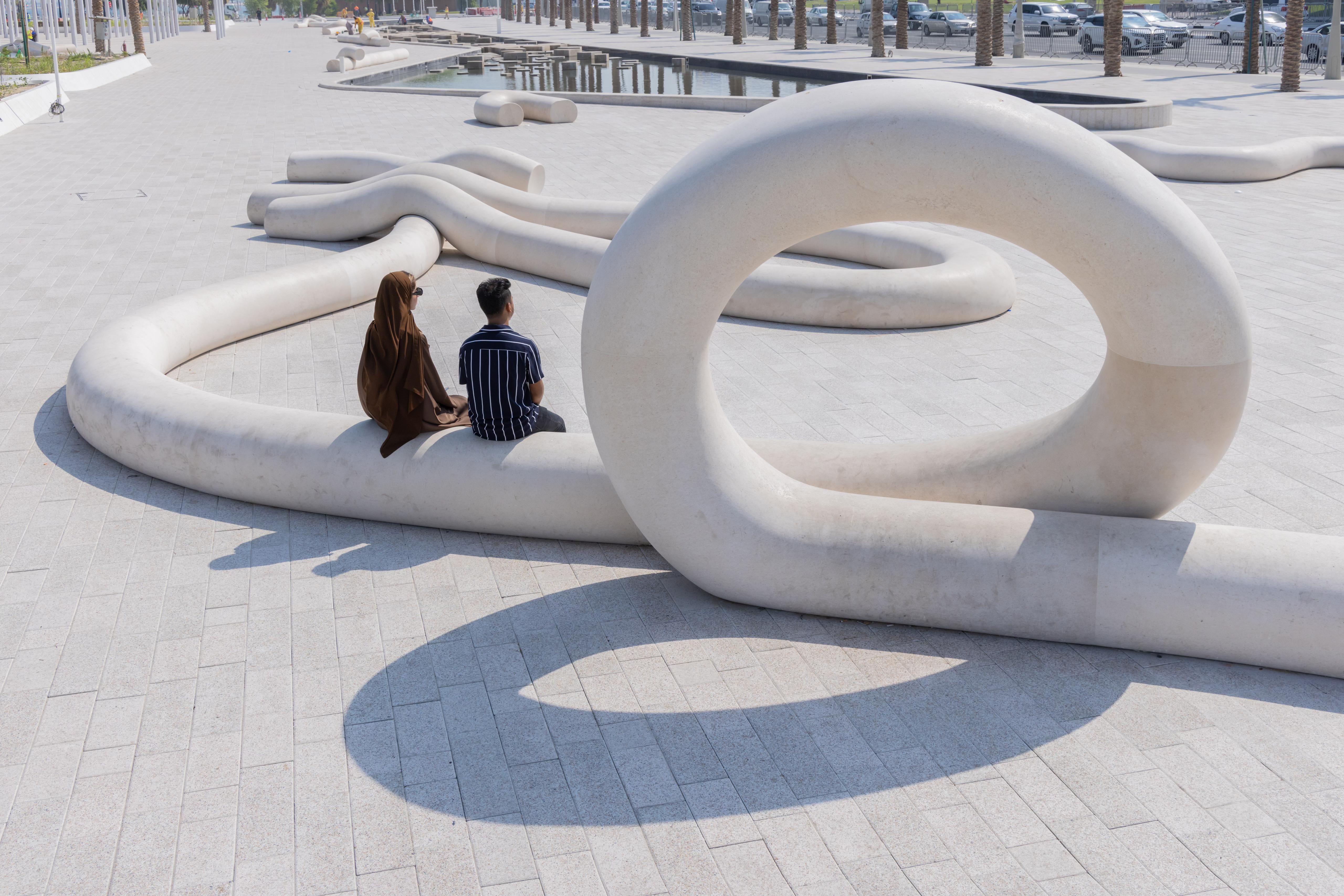 Among her most significant projects is the monumental installation Us, Her, Him (Nahnu, Hiya, Huwa) in Doha, commissioned by Qatar Museums, in collaboration with Friedman Benda gallery. Installed in 2022 at the Flag Plaza, the work comprises more than 300 meters of sculptural stone benches—at once functional and symbolic.