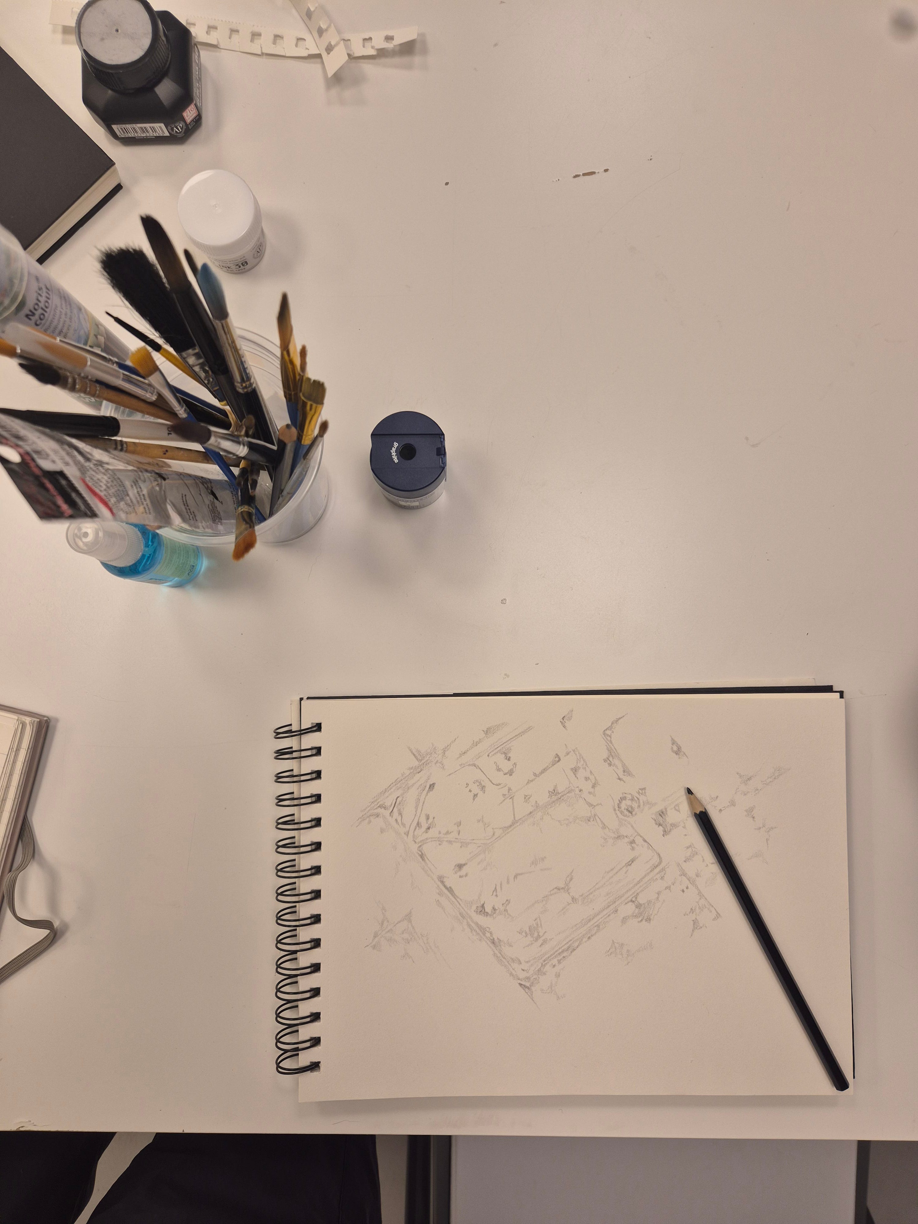 Alsarraf’s method is a deep excavation. “I love to deep dive into an area of interest and find out as much as I can about a topic before I generate any ideas,” she explains. She collects photographs, screenshots, and links, then sketches from life and observation. Only then does she move into painting, “abstracting the drawings into vast landscapes of their own,” before finishing with a “compilation of videos and sounds from the research edited to give context to the abstract works.”