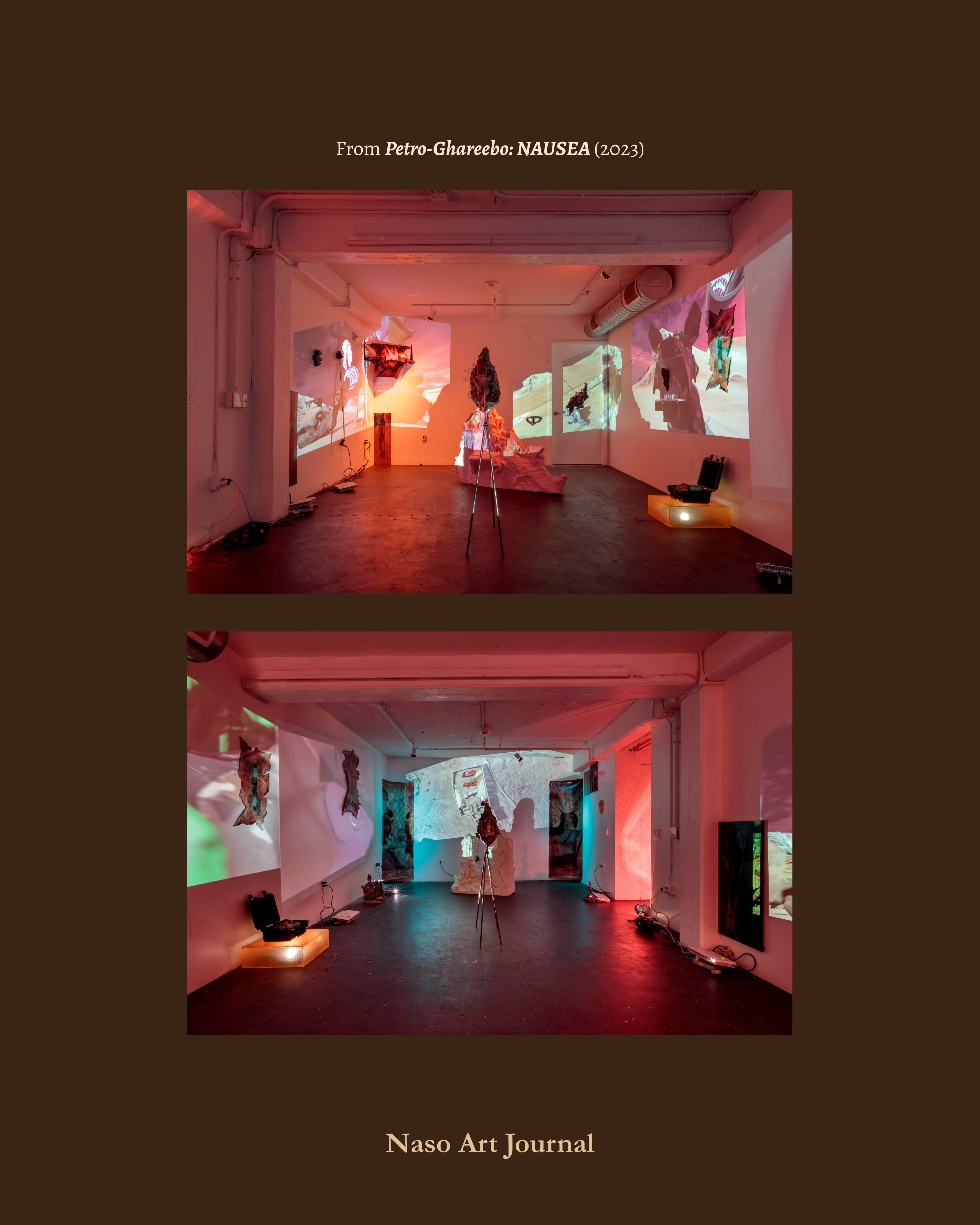 While originally rooted in painting, Talal’s recent work leans heavily into installation. "If you give me a space, I won’t hang paintings salon-style," he says. "I want to build environments—lights tinted and dimmed, visible wires, exposed projectors, overlapping videos on objects. Something immersive and disorienting, and without trying to hide the construction or mechanics of it as well."