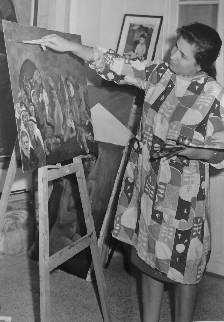 Tamam Al-Akhal (b. 1935) was born in Jaffa and displaced with her family during the Nakba. Her work, like that of her collaborator and spouse Ismail Shammout, emerged from the shared experience of exile but developed a distinct perspective, particularly through its emphasis on women’s roles within national and cultural narratives. Al-Akhal’s paintings frequently center female figures as symbols of endurance, continuity, and cultural transmission. In the mural series Palestine: The Exodus and the Odyssey, created with Shammout, Al-Akhal participated in constructing a sweeping visual chronicle of Palestinian displacement and struggle. Her individual work often combines figurative clarity with symbolic layering, foregrounding themes of loss, resilience, and the generational transmission of memory.